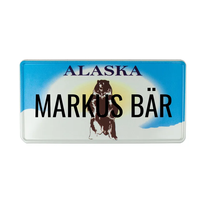 Bei diesem Schild handelt es sich um ein bekanntes und beliebtes US-Nummernschild, das vom Design her an ein Kennzeichen aus Alaska angelehnt ist. Auf dem Schild sind der Schriftzug Alaska und ein Bär zu sehen. Die Größe des Schildes entspricht der Originalgröße der USA Kennzeichen.