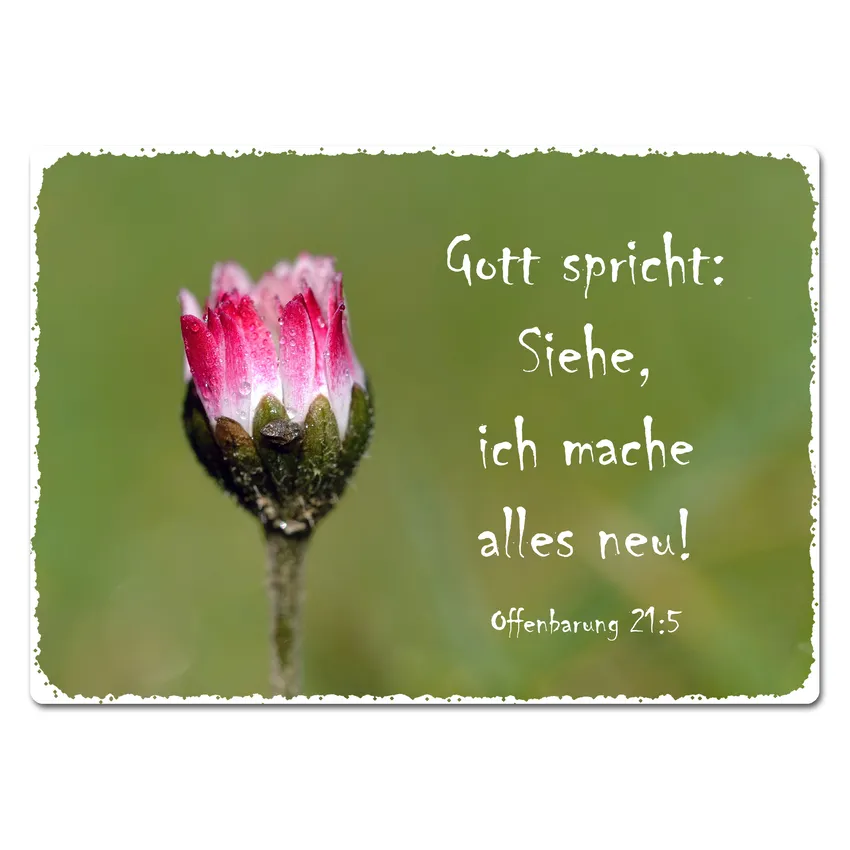 Das Blechschild wird mit dem Foto vom aufblühenden Gänseblümchen und mit der Jahreslosung 2026 gedruckt. Optional stehen mehre Befestigungsvarianten zur Verfügung.
