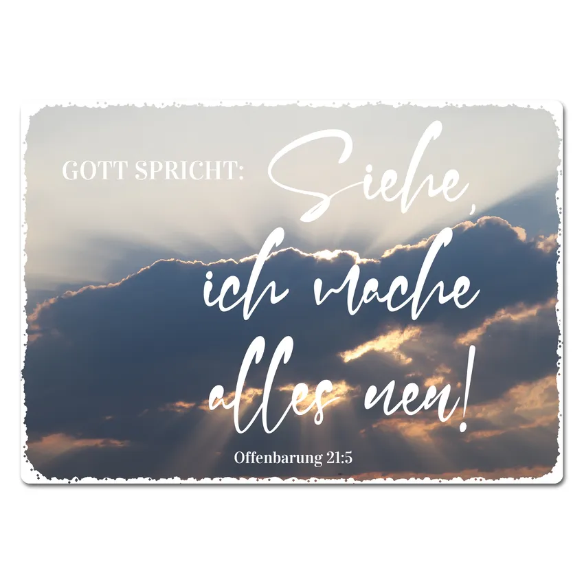 Das Blechschild wird mit dem Foto "Wolkenleuchten" und der Jahreslosung 2026 gedruckt. Optional stehen mehre Befestigungsvarianten zur Verfügung.