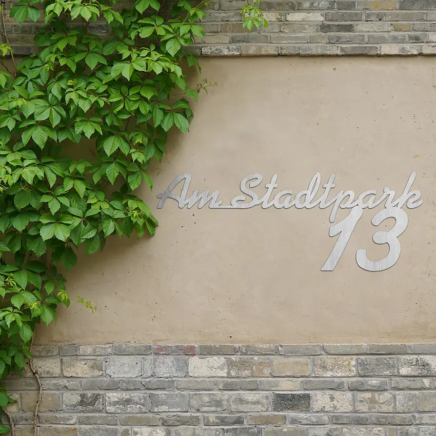 Hausnummer aus einem hochwertigen V2A Edelstahl: Straßenname mit Nummer in Schreibschrift