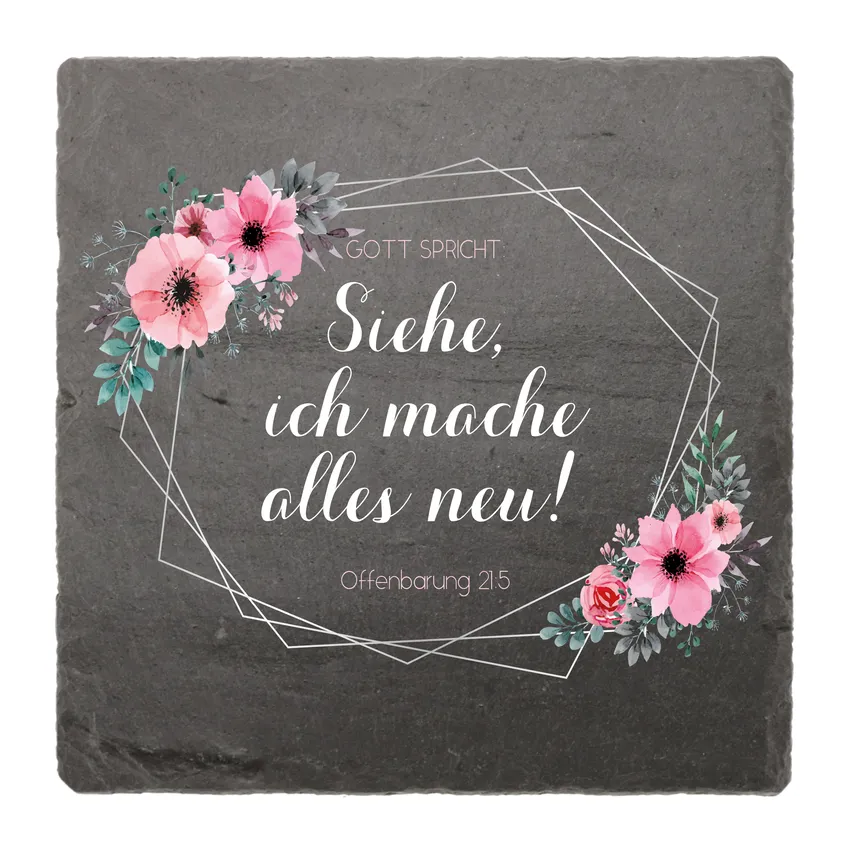 Die Schieferplatte wird mit dem Motiv Blumenrahmen und der Jahreslosung 2026 gedruckt. In unsicheren Seiten suchen wir nach festen Zusagen. Eine wirklich feste Zusage kann ein Christ nur in der Bibel und im Ausblick auf die hoffnungsvolle Zukunft finden, die uns Gott verspricht. Siehe, er macht alles neu. Das Alte muss vergehen, ein neues Reich wird kommen - er wird uns retten aus der tiefsten Not - indem er alles neu macht.